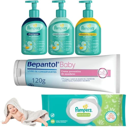 Kit Pampers Glicerina Bepantol Baby Creme Pomada Assaduras Bem vindo a a loja Flocus. É um prazer tê-lo a como nosso a cliente CONTEÚDO DO KIT: 1 Shampoo Pampers Glicerina - 200ml 1 Condicionador Pampers Glicerina - 200ml 1 Sabonete Líquido para o Corpo Pampers Glicerina - 200ml 1 Lenço Umedecido Pampers Aroma de Aloe Vera 48 unidades 1 Creme Preventivo de Assaduras Bepantol Baby - 120g Pampers Glicerina proporciona limpeza suave e segura do cabelo delicado de bebês e crianças. Ideal para todos os tipos de cabelo do bebê. O kit de Glicerina Pampers traz uma fórmula hipoalergênica pensada para o cuidado especial do cabelo delicado dos bebês e segura até para couro cabeludo sensível, trazendo maior suavidade e mantendo os fios macios. Além disso, proporciona uma lavagem suave e sem irritações nos olhos, evitando o desconforto das lágrimas durante o banho. Conta com pH ideal para o couro cabeludo do bebê e perfumação suave e segura para recém-nascidos. O Sabonete Líquido Pampers Glicerina foi criado pensando em um banho suave e seguro. Sua fórmula com Glicerina e Óleo de Girassol confere maior suavidade e mantém a pele do bebê macia. Com fórmula hipoalergênica, o sabonete da Pampers é seguro até para pele sensível e pode ser desde os primeiros dias. Conta com pH ideal para a pele do bebê e perfumação suave, segura para recém-nascidos. Os Lenços Umedecidos Pampers com Cheirinho De Aloe Vera que foram criados para aquela limpeza prática do dia a dia, porque além de serem suaves e resistentes, hidratam e refrescam a pele do seu bebê sem causar irritações, e podem ser em bumbuns, mão e rosto. Seu bebê limpinho e sem pele irritada com Pampers Incluímos nesse kit baby o Creme Antiassaduras Bepantol Baby que vai além dos antiassaduras comuns. Com sua fórmula exclusiva, livre de conservantes, forma uma barreira transparente que deixa a pele delicada do seu bebê respirar, mantendo-a sempre saudável. Possui Lanolina, que forma uma barreira protetora transparente no bumbum, e Pró-Vitamina B5, que penetra na pele do bebê deixando-a mais resistente contra assaduras. Além disso, Bepantol Baby é livre de perfumes, corantes e parabenos que podem sensibilizar a pele delicada do bebê. BENEFÍCIOS: Limpeza completa da cabeça aos pés; Sem álcool, fenoxietanol, parabenos e corantes; Testado e aprovado por pediatras e dermatologistas; Seguro até para couro cabeludo sensível; Hipoalergênico e seguro desde os primeiros dias; 98% de ingredientes naturais; Fórmula vegana e livre de crueldade animal; Mais suavidade e mantém a pele do neném macia; Hipoalergênico; Sem lágrimas. Bepantol Baby: protege a pele das assaduras, além de mantê-la resistente, macia e hidratada. MODO DE USAR: Shampoo: Coloque um pouco do shampoo em uma das mãos e espalhe pelo cabelinho molhado do bebê durante o banho. Massageie suavemente e enxágue em seguida com água. Condicionador: Coloque um pouco do condicionador ao longo dos fios e espalhe pelo cabelinho molhado do seu bebê durante o banho. Desembarace com facilidade deixando agir por alguns minutos. Enxágue bem em seguida com água. Sabonete líquido: Coloque um pouco do sabonete líquido em uma das mãos. Espalhe por todo o corpinho e cabelinhos molhados do seu bebê durante o banho. Massageie suavemente. Enxágue em seguida com água. Lenço umedecido: Para abrir a embalagem, levantar a etiqueta no local indicado. Retire uma toalhinha umedecida e use nas áreas que deseja limpar. OBS: Não jogue no vaso. Jogue a toalhinha umedecida Utilizado no lixo. OBS 2:Manter a embalagem bem fechada para conservar a qualidade do produto. Bepantol Baby: Aplique uma camada de Bepantol Baby em toda a troca de fralda. Agradecemos por escolher a Loja Flocus e por confiar em nós para cuidar da beleza dos seus cabelos. Em caso de dúvidas, favor enviar sua pergunta Flocus