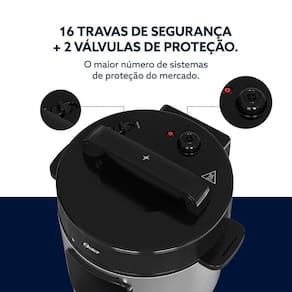 Sistema integrado que monitora e protege em múltiplas camadas: controle de pressão, detecção de temperatura, bloqueio inteligente da tampa e válvulas de alívio automático.