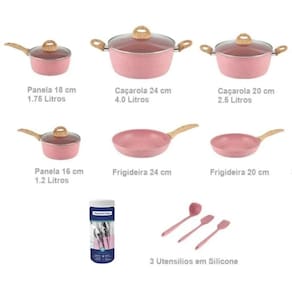 Conte?do da embalagem: 1 Panela com tampa: 16 cm 1,20L 1 Panela com tampa: 18 cm 1,75L 1 Ca?arola com tampa: 20 cm 2,5L 1 Ca?arola com tampa: 24 cm 4L 1 Frigideira: 20 cm 1 Frigideira: 24 cm Utens?lios: 3 em silicone