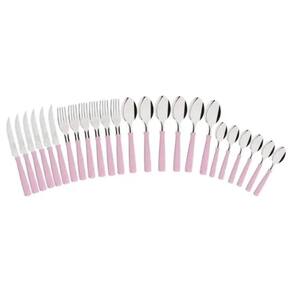 MODELO: 24 Pe?as L?minas de a?o inox. As l?minas das facas t?m maior durabilidade do fio devido ao tratamento t?rmico. Os garfos e colheres garantem maior resist?ncia devido a espessura do a?o e a estampagem das l?minas. Os cabos de polipropileno possuem maior resist?ncia e durabilidade. Podem ir ? m?quina de lavar lou?as facilitando seu dia a dia. Antes da primeira utiliza??o, lave bem as pe?as e seque-as. Tenha cuidado ao manusear produtos cortantes e perfurantes e mantenha-os fora do alcance das crian?as. Para maior durabilidade dos produtos recomenda-se secar bem antes de guardar, mesmo ap?s lavagem em m?quina. Para descarte dos produtos e embalagens siga as orienta??es de reciclagem vigentes.