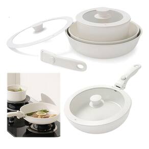 Produzidas com materiais livres de PFOA e PTFE, as panelas asseguram um cozimento e livre de substâncias nocivas. O design contemporâneo na cor branca, com detalhes em madeira e silicone, adiciona um toque de sofisticação à cozinha, combinando funcionalidade e beleza em um único conjunto.