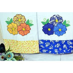 Jogo fabricado em tecido 100% algodão, na cor branco, com barrado em tecido floral nas cores azul, amarelo, rosa e lilás , com lindas flores bordadas e aplicadas combinando com o tecido floral do barrado.