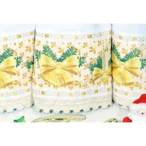 Confeccionados em tecido 100% algodão na cor branco, com barrado nas cores amarelo, verde e dourado, estampa digital de sinos, velas e laços, com detalhes em laise na cor palha e passa fitas branco com fita dourada.
