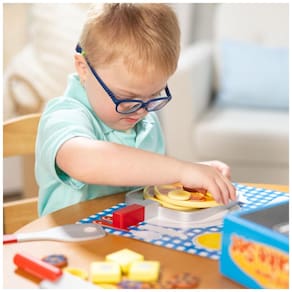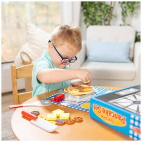 O conjunto inclui 2 panquecas, 9 discos de cobertura, 4 pedaços de manteiga, frigideira, faca, espátula e talheres de papel impresso. Todos os itens alimentares e utensílios apresentam construção de madeira resistente e a superfície do cooktop é impressa na parte de trás da caixa de armazenamento de papelão ondulado resistente. Além de proporcionar horas de diversão, o conjunto ajuda a ensinar a forma básica reconhecimento, sequenciamento e habilidades matemáticas iniciais, promovendo a coordenação olho mão, habilidades motoras finas, expressão criativa e brincadeiras imaginativas.
