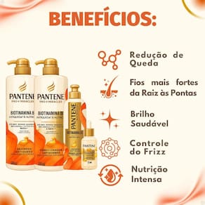 Kit Pantene Biotinamina B3 Antiqueda e Nutrição: Shampoo 510ml e Condicionador 510ml + Tônico 52ml + Creme de Pentear 240g Descubra o poder do Kit Pantene Biotinamina B3 Antiqueda e Nutrição, a solução completa para quem busca combater a queda de cabelo e fortalecer os fios da raiz às pontas. Este kit exclusivo da PANTENE, com sua linha Pro-V Miracles, oferece uma rotina de tratamento intensiva para cabelos frágeis e com queda devido à quebra. Com uma fórmula avançada enriquecida com Biotina B7, Vitamina B3 e Pantenol, ele nutre profundamente o couro cabeludo, promove o fortalecimento capilar e estimula o crescimento saudável, resultando em cabelos mais resistentes, hidratados e com um brilho espetacular.