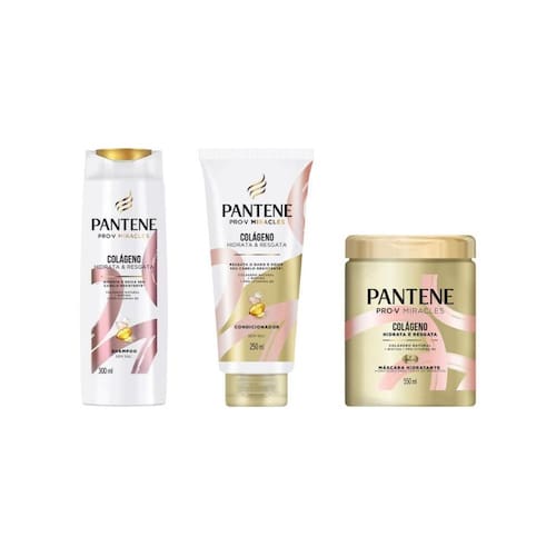 Esse kit contém: 1 Condicionador Pantene 250ml Colágeno + 1 Shampoo Pantene 300ml Colágeno e 1 Máscara de Tratamento Pantene 550ml Colágeno