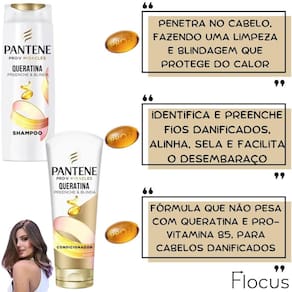 Kit Pantene Queratina Ampola Nutrição Umectante Pro-VMiracle Bem vindo a a loja Flocus. É um prazer tê-lo a como nosso a cliente CONTEÚDO DO KIT: 1 Pantene Pro-V Miracles Shampoo Queratina - 300 ml 1 Pantene Pro-V Miracles Condicionador Queratina - 250 ml 3 u. pantene pro-v Ampola Tratamento Nutrição Umectante 15ml cada Você já reparou o quanto você expõe o seu cabelo ao calor sol, Chapinha, Secador, modelador de cachos... . Apresentamos o shampoo e condicionador Pantene Queratina Preenche & Blinda, nossa fórmula Pro-V Miracles com Queratina. O shampoo penetra no cabelo, fazendo uma limpeza e blindagem que protege, enquanto o condicionador identifica e preenche fios danificados, para alinhar e selar, facilitando o desembaraço. Use o shampoo e condicionador e a linha completa Preenche & Blinda para uma reparação contra danos causados até pelo calor. Cabelos mais resistentes e brilhantes. Fórmula que não pesa com Queratina e Pro-Vitamina B5, para cabelos danificados. Ph balanceado. Descubra a nova fórmula da Ampola Capilar Pantene com Pérolas Pro-Vitaminas solúveis, que vai completar o seu cronograma capilar. Possui 2X mais poder nutritivo. Sua fórmula com Pérolas Pro-V que se dissolve no creme e Bambu é um preenchimento capilar com milhões de lipídios concentrados, deixando os cabelos fortes e nutridos. Ideal para cabelos com frizz ou pontas duplas. Transformação como você nunca viu, nem sentiu antes pro-vitaminas. extrato de Bambú. pérolas Pro-Vitaminas. INDICAÇÃO: Cabelo danificado; Cabelo opaco; Cabelo sem brilho. MODO DE USO: 1passo: Shampoo: Aplique sobre o cabelo úmido, massageie suavemente o couro cabeludo com a ponta dos dedos em movimentos circulares Enxágue e repita se necessário. Tire o excesso de água. 2passo: Ampola Pro-V: coloque o produto na palma da mão, misture com os dedos até dissolver as pérolas Pró-V no creme aplique uniformemente no cabelo úmido, do meio até as pontas. deixe gir por 3 minutos enxague bem. pode ser como potencializador na sua rotina de cronograma capilar. 3passo: Condicionador: Aplique uniformemente no cabelo úmido. Penteie com os dedos. Enxágue bem. Use a linha completa Queratina Preenche & Blinda para uma reparação contra danos causados até pelo calor. Cabelos mais resistentes e brilhantes. Agradecemos por escolher a Loja Flocus e por confiar em nós para cuidar da beleza dos seus cabelos. Em caso de dúvidas, favor enviar sua pergunta Flocus Marca: Não Informado