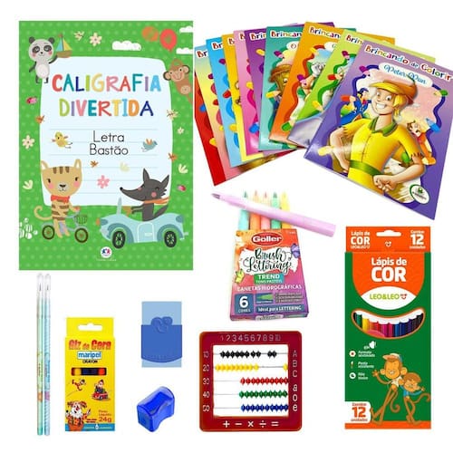 Kit Papelaria Abaco Colorir Caligrafia Contém: -1 kit Brush Lettering Gller 6 cores -1 kit giz de cera Maripel 6 cores -1 kit com 12 lapis de cor sextavado -1 apostila de caligrafia letras ou de Forma -1 Ábaco simples -1 kit Brincando de Colorir Coleção com 10 livrinhos, bela adormecida, bambi,branca de neve,etc. -2 lapiseiras -1 Apontador -1 Borracha Alguns dos itens, cores e modelos podem variar dependendo do disponível Marca: Não Informado