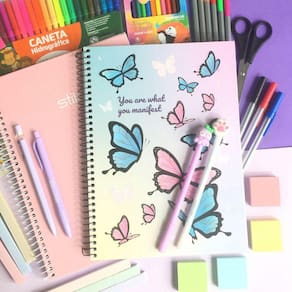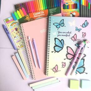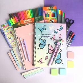 - 2 Cadernos universitarios liso ou estampado estampa aleatoria - 1 kit canetinha com 24 cores - 1 kit com 12 lapis de cor - 6 canetas fine line cores aleatorias - 3 canetas esferograficas vermelha, azul, preta - 2 canetas esferograficas coloridas cor aleatoria - 6 marca texto podendo ter alteração de cores e modelos - 4 bloquinhos de anotações - 1 lapiseira podendo ter alteração de cores e modelos - 2 canetas fofas modelos e cores aleatorios - 1 cartela de adesivo aleatorio - 5 marcadores de paginas - 1 tesoura podendo ter alteração de cores e modelos