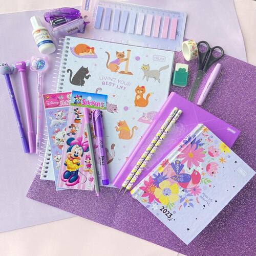 - 1 Caderno Universitário (podendo ir lilás, branco, tons de rosa, estampado ou liso)