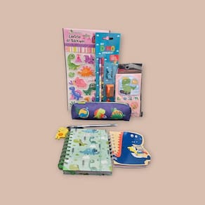 Este kit de papelaria inclui: - 1 estojo espaçoso para guardar todos os materiais de forma organizada. - 1 agenda para anotar compromissos, tarefas e lembretes importantes. - 1 caderneta para fazer anotações, desenhos ou escrever pequenos textos. - 1 caneta fofa com pop it, que proporciona uma experiência tátil e divertida ao escrever. - 1 cartela de adesivos com diferentes designs de dinossauros, perfeita para decorar cadernos, agendas e outros objetos. - 1 kit de post it, ideal para marcar páginas, fazer pequenas anotações ou deixar recados. - 1 blister com 2 lápis, apontador e borracha, para garantir que você tenha sempre os materiais básicos à mão.
