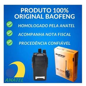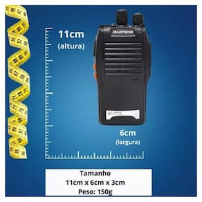 Com uma capacidade impressionante de 16 canais, este rádio permite que você se comunique rapidamente, com segurança e sem custos adicionais.Não importa onde você esteja, você nunca perderá a conexão.Confiança na Comunicação InabalávelNão há espaço para interrupções na comunicação quando se trata deste rádio. Mantenha-se conectado e confie no melhor dispositivo que faz parte da segurança de seu local.Detalhes TécnicosTudo em Um: UHF, VHF e Rádio FM, todas as opções em um único dispositivo.16 Canais: Escolha entre 16 canais para comunicação personalizada.Ampla Faixa de Comunicação: Alcance de 1 a 12km (a distância pode variar de acordo com o ambiente e obstáculos).Versatilidade de Energia: Funciona com 110/220V.Ampla Faixa de Frequência: Frequência de 400~470MHz.Entradas MIC e SP: Conectividade completa.Dimensões Compactas: Apenas 115mm x 60mm x 33mm.Leve e Portátil: Peso de apenas 150g.Especificações de EnergiaBateria de Alta Capacidade: 1500mAh para uma longa duração.Potência RF Classificada: 5W para comunicação confiável.Tensão de Operação: 3.7V / Bateria.Voltagem: 7.4V.Itens Inclusos02 Rádios Comunicadores Walkie Talkie Baofeng BF-777S.02 Baterias.02 Fontes Carregadoras.02 Antenas.02 Alças de Pulso.02 Clipes de Cinto.02 Fones de Ouvido.Linha Walk Talk 777Modelo BF-777SVoltagem 100V/240VQuantidade de rádios 2Tipos de alimentação: Bateria Li-IonQuantidade de canais: 16Alcance máximo: 6 kmÉ digital NãoCom Bluetooth NãoCom Wi-Fi NãoCom tela NãoCom teclado numérico NãoCom lanterna: SimCom função mãos livres: SimInclui pilhas: NãoHomologação Anatel Nº 129702214108Capacidade da bateria 1500 mAhFabricante BaofengTipos de tecnologia AnalógicaDuração da bateria 8 h