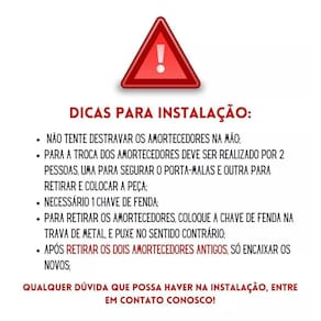 Dicas para a Instalação: *Não tente destravar os amortecedores com as mãos, pois só conseguirá destravar depois de instalado no veículo; *A troca dos amortecedores tem que ser realizada por duas pessoas, uma para retirar e colocar as peças, e a outra para segurar o porta-malas; *Necessário somente 1 chave de fenda; *Para retirar os amortecedores antigos, já instalados no carro, coloque a chave de fenda na trava de metal, e puxe no sentido contrário; *Após retirar OS DOIS amortecedores antigos, só encaixar os novos;