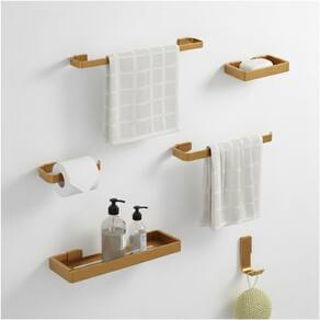 Kit para Banheiro Completo - Porta Toalha, Saboneteira e Gancho - Dourado Kit para Banheiro Completo - Organização e Praticidade em 6 Peças 6 peças em aço dourado: Porta toalha 45 cm , porta toalha rosto 22 cm , gancho, saboneteira, porta shampoo e porta papel higiênico. Dimensões inteligentes: Ideal para banheiros pequenos ou grandes. Cada peça foi projetada para otimizar espaço. Instalação simples: Vem com parafusos e buchas. Você mesmo instala em minutos. Material durável: Aço resistente à umidade, não enferruja e é fácil de limpar. Saboneteira e porta shampoo com ripas: Evita acúmulo de água e mau cheiro. Prático e funcional: Toalhas secam rápido, itens sempre organizados. Dúvidas frequentes: Cabe no meu banheiro Sim, as peças são compactas e versáteis. Aguenta peso Sim, cada gancho suporta até 5 kg. Precisa de para instalar Não, a instalação é simples e rápida. Marca: Não Informado