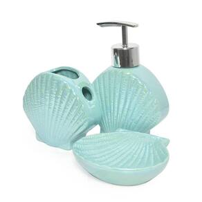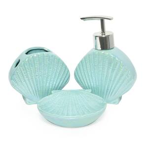 Kit para banheiro lavabo 3 peças sereia concha perolado Cor: verde Deixe seu banheiro ainda mais lindo com esse kit, possui pintura perolada que da ainda mais brilho e sofisticação para o ambiente, o kit conta com 1 porta sabonete liquido, 1 porta sabonete e 1 porta escovas de dente/pasta.