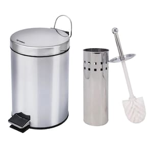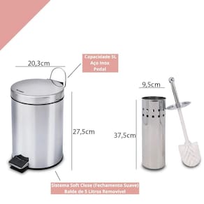 Lixeira de banheiro 5 litros e escova sanitária, em aço inox e com detalhes sofisticados. Lixeira com balde removível e pedal acoplado que auxilia na higiene e evita a proliferação de bactérias, também com sistema soft close, que proporciona um fechamento suave. A escova sanitária com cerdas flexíveis, e com ótima durabilidade e resistência. Marca: global mix características -cor: prata; -material: aço inox 410, abs, borracha e nylon; -dimensões da peça: lixeira de 5 litros: 20,3x27,8cm escova sanitária: 9,5x 34,5cm