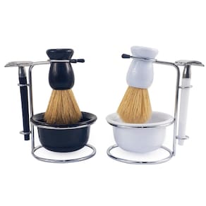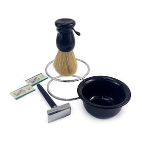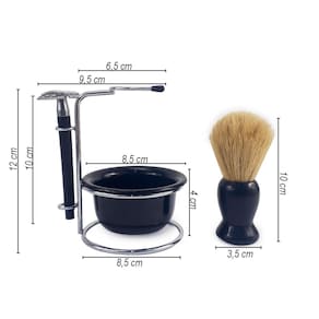 Este kit de barbear é ideal para você que gosta de fazer sua barba, acompanha uma tigela para mistura de espuma de barbear um suporte de metal um barbeador de metal e duas lâminas, além do uso pessoal também é um ótimo presente para seu pai, amigo, namorado.
