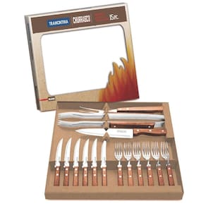 Informações Técnicas: Facas: lâminas com maior durabilidade do fio devido ao tratamento térmico. Garfos: a espessura do aço e a estampagem das lâminas garantem maior resistência aos produtos, evitando deformações. Cabos rústicos e naturais. Permanecem bonitos por muito mais tempo. Lâminas em aço inox. Cabos de madeira fixados por rebites de alumínio. Referência: 22399028 Informações Adicionais: churrasco brasileiro é um dos mais respeitados do mundo e nasceu no pampa, na região Sul do país. A Tramontina tem muito orgulho de ter nascido no mesmo lugar. É por isso que criou uma linha de produtos completa com o melhor aço, madeira tratada e muita tecnologia para você fazer bonito e continuar evoluindo o seu churrasco sempre.