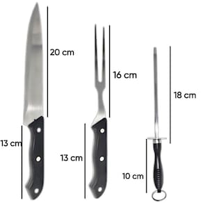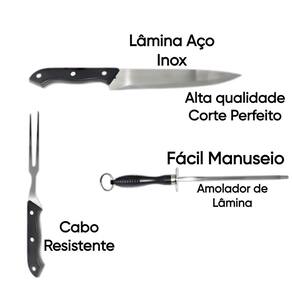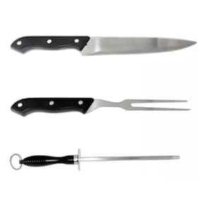 Olá seja bem vindo (a) a loja Mandacaru & VarejoO Kit para Churrasco com 3 Peças, Garfo, Faca e Chaira, facilita seu churrasco trazendo qualidade e praticidade, feito de Inox e Plástico durável, perfeito para momentos em família ou com amigos. Contém: - Faca: 31cm- Garfo: 27cm- Chaira: 29cm Material: Aço Inox e Plástico Disponível nas cores: - Preto Ean: 7891100052258