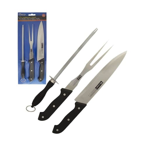 Descrição Kit Churrasco 3 Peças Western N-23 - Material: Aço Inoxidável, PP - Cor: Cor cabo preto - Tipo de Embalagem: Blister - Marca: Westem - Origem: China Indicações: - Indicada para cortar e fatiar carnes, legumes, frutas, e também para picar cebola, temperos em geral, alho e salsinha. - Faca legumes -indicada para descascar e cortar legumes e frutas. também faz cortes pequeno e decorativo. Garfo trinchante Indicado para manusear peças de bife ou carne crua. - Recomendações: - Mantenha a faca afiada. - Sempre guarde a faca e o garfo secos Atenção: - Cuidado ao manusear produtos cortantes e perfurantes. - Guarde em local seguro. - Guarde estas instruções para futuras consultas. - Manter fora do alcance das crianças. Marca: Westem