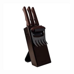 - Composição do Kit: 1 Faca para Carne 8", 1 Faca Butcher 10", 1 Faca para Desossar 6", 1 Garra Multiuso, 1 Suporte de Madeira para Facas;