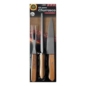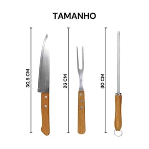 Jogo para Churrasco 3 PEÇAS com Lâminas em Aço Inox e Cabos de Madeira Natural 3 Peças você irá servir as melhores carnes de um jeito prático e saboroso. São três peças ideais para levar bom gosto e sofisticação à este momento. Com lâmina em aço inox, a faca de 7 polegadas possui maior durabilidade do fio devido ao tratamento térmico. O garfo e pegador contam com maior espessura e uma estampagem do aço que garante maior resistência, evitando deformações. São peças com cabo de madeira natural que deixam a mesa do churrasco ainda mais bonita.