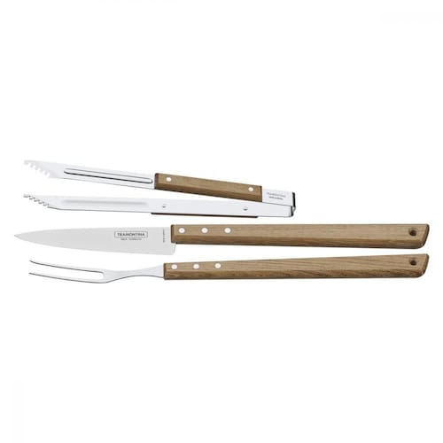 Lâminas de aço inox. A lâmina da faca têm maior durabilidade do fio devido ao tratamento térmico. As lâminas do garfo trinchante e pegador para carne contam com maior espessura e uma estampagem do aço que garante maior resistência, evitando deformações. Os cabos são de madeira natural. Rebites de alumínio.