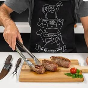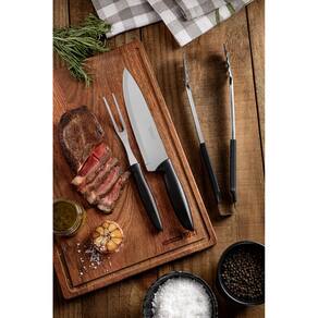 Lâminas de aço inox. A lâmina da faca tem maior durabilidade do fio devido ao tratamento térmico. A lâmina do garfo conta com maior espessura e uma estampagem do aço que garante maior resistência, evitando deformações. O pegador de aço inox com proteção emborrachada proporcionam resistência durante o uso. Os cabos de polipropileno possuem maior resistência e durabilidade. Podem ir à máquina de lavar louças facilitando seu dia a dia.