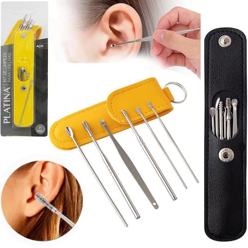 Kit para limpeza de ouvido de inox com 6 peças + estojo Informações adicionais: Ean: 7908169017859 Validade: indeterminada Tamanho aproximado do estojo: 10,3x3cm Tamanho aproximado da embalagem: a:21xl:7cm Peso aproximado: 35g Tipo de produto: kit para limpeza de ouvido com 6 peças + estojo Cor: preto e prata Composição: inox e tecido