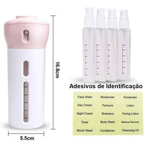 Incrível dispenser viagem 4 em 1 para guardar cosméticos, shampoo, cremes, hidratantes, óleos, entre outros. 100% recomendado para viagens curtas ou longas, para caminhoneiros, ou simplesmente usar em sua própria casa, pois a praticidade do produto é um diferencial que irá agilizar o seu dia-a-dia.Leve com você até 4 cosméticos diferentes, o corpo resistente do produto protegerá todo o conteúdo interno, evitando assim, que seus produtos sejam amassados e derramados dentro de mochilas e malas.Para despejar seus cosméticos, o porta cosméticos conta com uma válvula de pressão eficiente e macia, facilitando o uso sem causar nenhum problema.Tenha sempre à disposição seus cosméticos mais usados, evitando perdas e excesso de bagagem ao sair de casa.Especificações:Material: abs, pc.Capacidade de cada frasco: 40 ml.Medidas: 5.5 cm de diâmetro e 16.8 cm de alturaConteúdo da embalagem: 1 estojo rígido, 1 cartela de adesivos e 4 frascos de 40 ml cada.Cor: aleatório conforme estoqueDicas do produto:1- sempre que trocar de cosmético em um frasco, higienize com água corrente e sabão.2- não misture mais de um cosmético no mesmo frasco.3- não deixar no sol extremo por muito tempo.Dúvidas frequentes.Quais produtos posso colocar nos frascos R : cosméticos em geral, shampoo, condicionador, hidratante, óleos comporais, cremes, protetor solar, loções, gel, entre outros.Qual a capacidade de cada frasco R : cada frasco comporta 40 ml.O produto é resistente R : sim, o exterior é feito em plástico abs, é rigído e resistente.Excelente produto, compre agora e garanta o melhor preço.