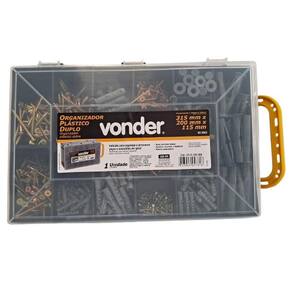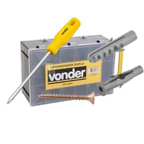 Descrição Descrição: Kit Parafuso Chipboard com maleta organizadora plástica dupla VD 2003 VONDER. Acompanha bucha plástica para tijolo vazado, bucha plástica de fixação + parafusos madeira chipboard, cabeça chata, fenda cruzada/phillips Vonder + 1 Chave Philips - Parafusos Possui acabamento bicromatizado, que aumenta a resistência contra corrosão/oxidação, além de cabeça tipo phillips, que proporciona maior força de aperto e menor possibilidade da chave ou bits escapar e riscar a peça que está sendo trabalhada.Indicado para fixações em madeiras e derivados, como: aglomerados, pínus e MDF. Pode ser utilizado também em alvenaria com o auxílio de uma bucha para tijolo vazado, que acompanha o kit. Conhecido como parafuso CHIPBOARD. devido a sua rosca com filetes espaçados e ângulo agudo, permite a aplicação sem a necessidade de pré furo - Bucha Bucha plástica de fixação - Excelente elasticidade, amortecendo vibrações. Indicada para fixações em concreto e alvenaria. Bucha plástica para tijolo vazado -Fabricadas em plástico de elevada qualidade, garantindo uma instalação segura e fixação de qualidade. Indicada para fixações em tijolo vazado/oco. - Organizador plástico duplo, VD 2003, VONDER Organizador plástico. Duplo, com duas tampas e divisórias removíveis e adaptáveis. Indicado para organizar e armazenar peças e acessórios em geral. - Conteúdo da maleta organizadora: Parafusos 100 Peças - Parafuso Para Madeira 3,5 X 14mm Cabeça Chata Bicromatizado 100 Peças - Parafuso Para Madeira 4,0 X 25mm Cabeça Chata Bicromatizado 100 Peças - Parafuso Para Madeira 4,0 X 35mm Cabeça Chata Bicromatizado 100 Peças - Parafuso Para Madeira 4,0 X 40mm Cabeça Chata Bicromatizado 050 Peças - Parafuso Para Madeira 4,0 X 45mm Cabeça Chata Bicromatizado 050 Peças - Parafuso Para Madeira 6,0 X 40mm Cabeça Chata Bicromatizado