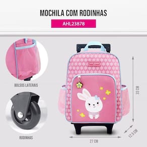 Rodinhas para facilitar o transporte, bolso frontal com zíper e laterais para garrafinha.