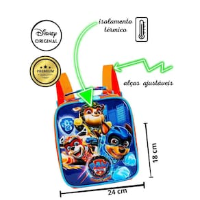 A lancheira também é produzida em poliéster e possui um material interno térmico, que ajuda a manter a temperatura dos alimentos por mais tempo. Com dimensões de 22 x 20 x 8 cm altura x largura x profundidade , é compacta e fácil de transportar. Os zíperes também têm puxadores personalizados, combinando com a mochila.