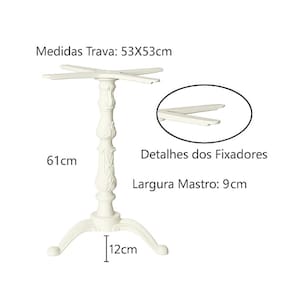 Medidas Pé de Mesa:Contém Niveladores de altura nos pés.Pintura: Eletroestática Branca. Distância entre os pés: 46cm.Largura do Mastro: 9cm.Peso Total: 6,100Kg.Altura Mastro: 61cm.Altura do Pé: 12cm.Altura Total: 75cm.