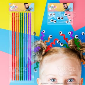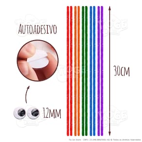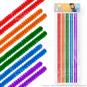 - 1 Pacote com 10 Hastes Flexíveis de Pelúcia de 30cm cada nas cores Vermelho, Laranja, Verde, Azul e Roxo (2 und de cada);