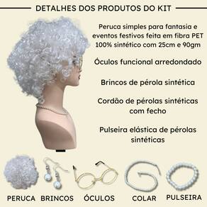 - Fibra kanekalon pet; - 25cm de comprimento; - Modelo Wig Tradicional; - Temperatura máxima aceita 130º ; - Tamanho da peruca M (Produto flexível); - 90 gramas em média;- Kit completo com peruca, brincos, óculos, colar e pulseira.