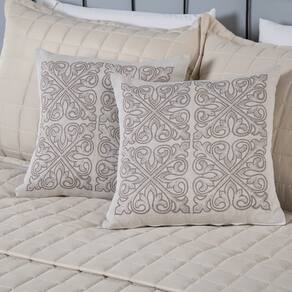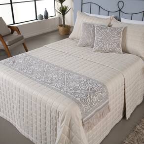 QUANTIDADE DE PEÇAS E MEDIDAS APROXIMADAS (LARGURA X ALTURA): 01 Peseira decorativa 2,00m x 40cm. 02 Capas para almofadas 45 x 45cm. 02 Refis de almofadas (enchimento) 45 x 45cm.