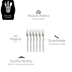 Conjunto Prático e Colorido: O kit acompanha 06 garfinhos em aço inox, cada um com 10cm de comprimento, tornando-os ideais para petiscar de forma prática e higiênica.