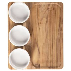 Kit Petisqueira Madeira Mista 28 cm com Três Potes Porcelana 75 mm Churrasco Tramontina - Petisqueira Tramontina em madeira mista com ramequins de porcelana