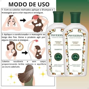 Shampoo Hidratação Intensa Phytoervas: Aplique o shampoo nos cabelos molhados, massageando suavemente para formar espuma. Enxágue bem e, se necessário, repita a aplicação. Aplique o shampoo com o intuito de limpar profundamente, removendo impurezas e prepará-los para a hidratação profunda com o condicionador.
