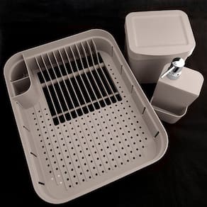 Ideal para você que busca aliar a praticidade no dia a dia com sua pia organizada. O kit utensílios de cozinha é essencial na composição do ambiente. O escorredor de pratos, porta detergente e lixeira de pia são indispensáveis no espaço. De material resistente e que não transfere odor, o escorredor de louça, permite separar e organizar pratos, copos e outros utensílios em cima da bancada, com base vazada para o escoamento da água. O dispenser de detergente comporta o produto de limpeza e esponja, deixando a pia organizada. E a lixeira para cozinha, por ser compacta proporciona praticidade.