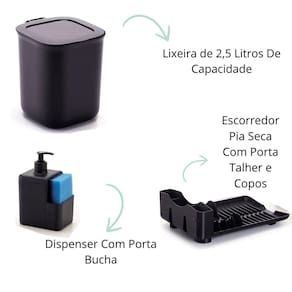 Kit Pia Escorredor 4 Pratos Dispenser Lixeira 2,5L Cor Preto