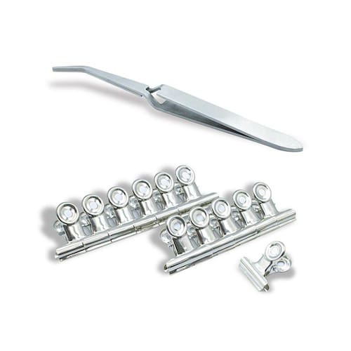 Contém: 12 - Presilhas Curvatura C Inox 22 mm; 01 - Pinça Para Unhas Curvatura C.