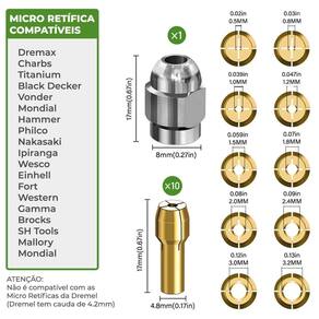 Kit pinças mandril e brocas 0,5 a 3,2mm 36 peças para micro retífica Precisão total em cada detalhe do seu trabalho Seu projeto merece mais do que um acessório . Esse kit de 10 pinças de latão + 1 mandril adaptador em aço oferece o encaixe firme e preciso que você precisa para brocas e acessórios de 0,5mm até 3,2mm, compatível com a grande maioria de micro retíficas do mercado. Acompanha 25 brocas Itens inclusos: - 10 pinças em latão: 0.5 / 0.8 / 1.0 / 1.2 / 1.5 / 1.8 / 2.0 / 2.4 / 3.0 / 3.2mm - 1 mandril adaptador porca em aço 8mm de diâmetro externo - 25 brocas hss: 0.5 5x / 0.6 5x / 1.0 3x / 1.2 2x / 1.5 2x / 1.8 2x / 2.0 2x / 2.35 2x e 3.0 2x Especificações do mandril - rosca da porca: m8 x 0,75mm - passo da rosca: 0,75mm - para micro retíficas com rosca m8 aproximadamente 7,4mm - material: aço usinado Especificações das pinças - comprimento total: 17mm - diâmetro da haste: 4.8mm 3/16 favor comparar com a sua máquina - diâmetro da ponta: 6mm - medidas podem ter variação de +- 0.1mm - material: 100% latão Especificações das brocas - fabricadas em aço rápido hss - totalmente polidas - indicada para furação em metal, plástico e madeira Compatibilidade Compatível com as principais micro retíficas do mercado Para ter certeza se o produto é compatível com a sua micro retífica, compare as dimensões informadas nas fotos, dando atenção em especial a seguinte especificação: - diâmetro da porca: 8mm - diâmetro da cauda da pinça: 4,8mm - marcas compatíveis: dremax, charbs, titanium, black decker, vonder, mondial, philco, nakasaki, wesco, einhell, fort, western, gamma, brocks, sh tools, mallory, mondial, e outras Benefícios que fazem a diferença: - evita folgas e vibrações, mais segurança e precisão em qualquer aplicação - acabamento profissional, encaixe perfeito mesmo nas brocas mais finas - pronto para uso imediato sem necessidade de adaptadores extras - durabilidade e resistência : corpo em latão + mandril em aço usinado Como usar - escolha a pinça de acordo com o diâmetro da broca/acessório. - insira a pinça no mandril até o encaixe. - rosqueie o mandril na micro retífica e ajuste. - encaixe a broca e aperte até fixar totalmente. - pronto mais firmeza e precisão para qualquer tarefa.