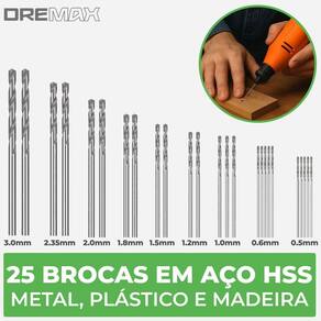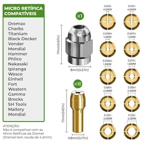 Kit pinças mandril e brocas 0,5 a 3,2mm 36 peças para micro retífica Precisão total em cada detalhe do seu trabalho Seu projeto merece mais do que um acessório . Esse kit de 10 pinças de latão + 1 mandril adaptador em aço oferece o encaixe firme e preciso que você precisa para brocas e acessórios de 0,5mm até 3,2mm, compatível com a grande maioria de micro retíficas do mercado. Acompanha 25 brocas Itens inclusos: - 10 pinças em latão: 0.5 / 0.8 / 1.0 / 1.2 / 1.5 / 1.8 / 2.0 / 2.4 / 3.0 / 3.2mm - 1 mandril adaptador porca em aço 8mm de diâmetro externo - 25 brocas hss: 0.5 5x / 0.6 5x / 1.0 3x / 1.2 2x / 1.5 2x / 1.8 2x / 2.0 2x / 2.35 2x e 3.0 2x Especificações do mandril - rosca da porca: m8 x 0,75mm - passo da rosca: 0,75mm - para micro retíficas com rosca m8 aproximadamente 7,4mm - material: aço usinado Especificações das pinças - comprimento total: 17mm - diâmetro da haste: 4.8mm 3/16 favor comparar com a sua máquina - diâmetro da ponta: 6mm - medidas podem ter variação de +- 0.1mm - material: 100% latão Especificações das brocas - fabricadas em aço rápido hss - totalmente polidas - indicada para furação em metal, plástico e madeira Compatibilidade Compatível com as principais micro retíficas do mercado Para ter certeza se o produto é compatível com a sua micro retífica, compare as dimensões informadas nas fotos, dando atenção em especial a seguinte especificação: - diâmetro da porca: 8mm - diâmetro da cauda da pinça: 4,8mm - marcas compatíveis: dremax, charbs, titanium, black decker, vonder, mondial, philco, nakasaki, wesco, einhell, fort, western, gamma, brocks, sh tools, mallory, mondial, e outras Benefícios que fazem a diferença: - evita folgas e vibrações, mais segurança e precisão em qualquer aplicação - acabamento profissional, encaixe perfeito mesmo nas brocas mais finas - pronto para uso imediato sem necessidade de adaptadores extras - durabilidade e resistência : corpo em latão + mandril em aço usinado Como usar - escolha a pinça de acordo com o diâmetro da broca/acessório. - insira a pinça no mandril até o encaixe. - rosqueie o mandril na micro retífica e ajuste. - encaixe a broca e aperte até fixar totalmente. - pronto mais firmeza e precisão para qualquer tarefa.