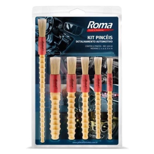 Kit Pinceis Detalhamento Automotivo - Roma Sem Variação único Kit 6 peças de pincel para linha de detalhamento automotivo. Cerdas sintéticas com pontas extra finas facilitando a limpeza sem agredir a superfície. Também oferecem maior resistência ao desgaste e durabilidade do produto.
