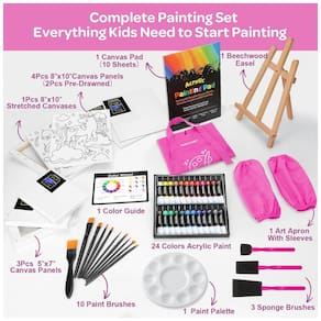 O conjunto traz um cavalete de mesa em madeira de faia maciça fornecido montado, adequado para apoiar telas no formato 20,3 cm x 25,4 cm e 12,7 cm x 17,8 cm durante a pintura. Acompanha 10 pincéis de cabo curto, 3 pincéis de esponja, paleta para mistura, bloco de 10 folhas de canvas no formato 22,9 cm x 30,5 cm, quatro painéis de canvas 20,3 cm x 25,4 cm, três painéis 12,7 cm x 17,8 cm e uma tela esticada 20,3 cm x 25,4 cm.
