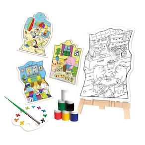 Contém: 4 telas, 6 tintas guache, 1 cavalete 1 gôde, 1 pincel e 12 cards para colorir.