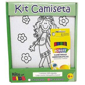 Kit Pintura em Camiseta - Menina - Tamanho P de 4 a 6 anos - Kits for Kids Kit composto por 1 camisetas 100% algodão tamanho P indicado para crianças entre 4 e 6 anos, 1 jogo caneta hidrocor lavável. Material: tecido. Para transformar nossas crianças em pequenos artistas, criando uma linda obra de arte, que elas irão vestir e se divertir Estimula a criatividade e diversão. Medidas da embalagem: C x A x L 22 x 26 x 2 cm. Idade: a partir 6 anos. Prazo de garantia: 03 meses de garantia legal. Observe atentamente a idade recomendada para o brinquedo. Fotos ilustrativas as cores e modelos podem sofrer alterações sem aviso prévio. CE-BRI/INNAC 00156-000 NM300/2002
