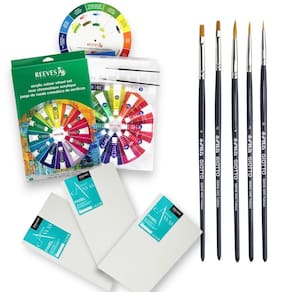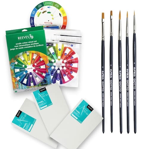 KIT CONTENDO 01 ESTOJO TINTA ACRILICA 12 CORES REEVES 01 CIRCULO CROMATICO 01 GODE 5 PINCEIS GIOTTO 03 TELAS 20x30